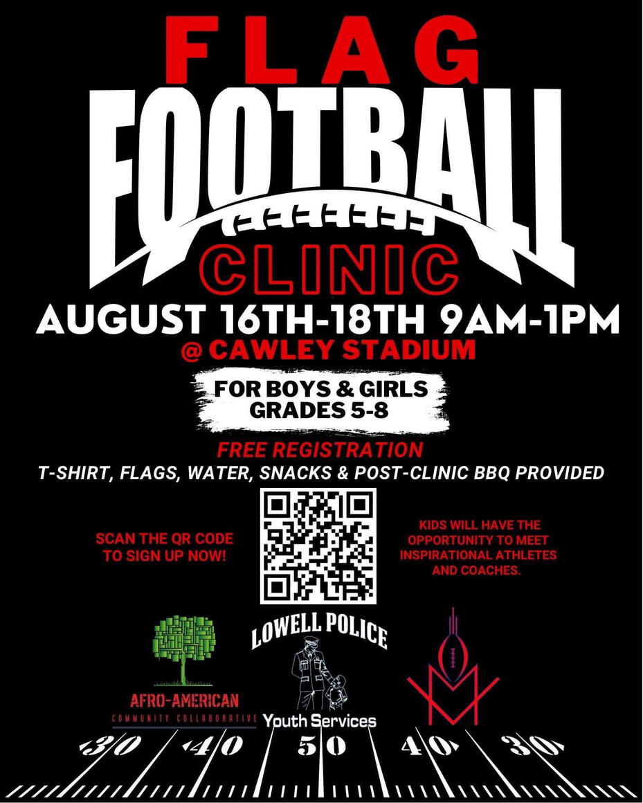 Afro-American Community Collaborative, Lowell Police Youth Services Program, and Merrimack Valley Flag Football collaborated on a free flag football clinic for Lowell youth.Students at the clinic got to meet and talk to former Lowell High School football star John Blake Galvin, who went on to play for Boston College and then the Jets and Vikings in the NFL, and Leon Powe, a former power forward for the Boston Celtics who shared in the team’s 2008 championship. Lowell High School Football Coach Shyheim Cullen also attended and spoke to the students.Approximately 60 Lowell youth in grades 5 to 8 participated in the clinic from Aug. 16-18 at Cawley Stadium, with T-shirts, flags, water, snacks, and even a post-clinic BBQ provided.